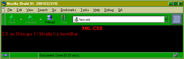 In Abbildung 4 wird dargestellt, wie ein XML-fähiger Browser (im Beispiel Mozilla) eine XML-Datei mit gelinktem Style Sheet darstellt. Nur mittels dieser CSS-Datei hat der Browser die Möglichkeit eine XML-Datei zu formatieren. In der Datei style3.css ist ein Kommentar verwendet worden: Kommentare werden in eine CSS-Definition zwischen /* und */ angegeben.